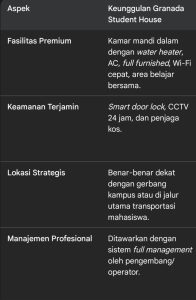 Kesimpulan: Dengan memilih investasi properti kos dengan konsep modern dan manajemen profesional seperti Granada Student House, investor tidak hanya mendapatkan pendapatan sewa bulanan yang stabil (lebih tinggi dari kos biasa), tetapi juga menikmati kenaikan nilai properti di lokasi strategis. Bisnis ini memadukan kebutuhan dasar (hunian) dengan gaya hidup (kenyamanan dan fasilitas modern), menjadikannya peluang bisnis terbaik dan paling berkelanjutan di kota pendidikan.